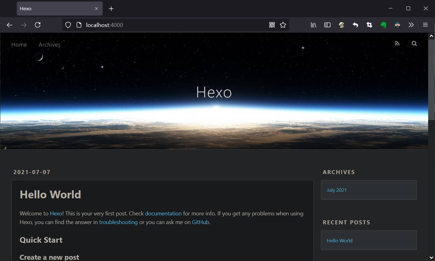 hexo server本地打开博客网站,浏览器打开http://localhost:4000,缩写为hexo s