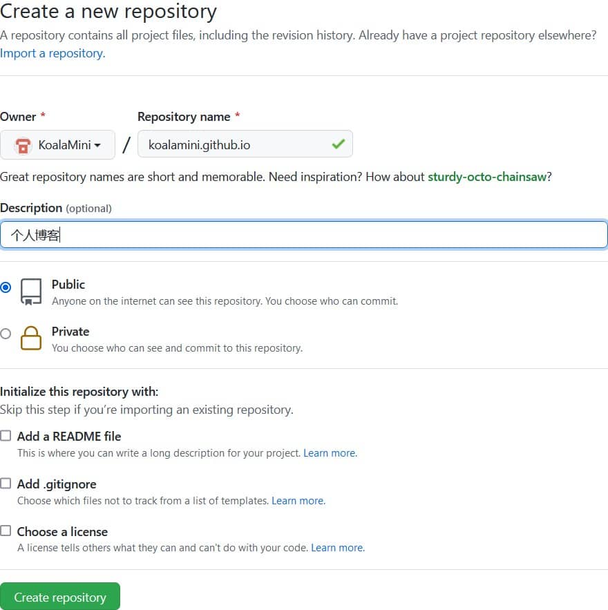 npm install hexo-deployer-git安装 git 部署工具 - 打开github,新建仓库,注意仓库名称要以